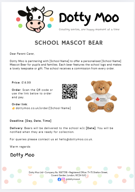 If you are visiting from a school and would like to offer Dotty Moo mascot bears, please get in touch via our contact page.